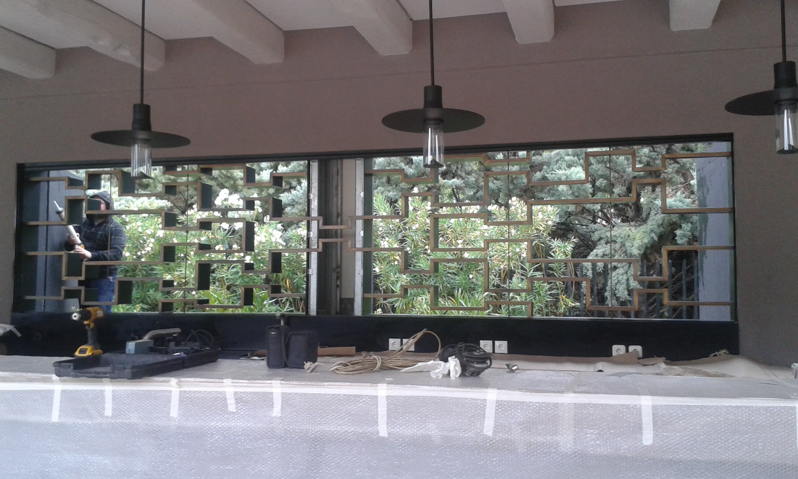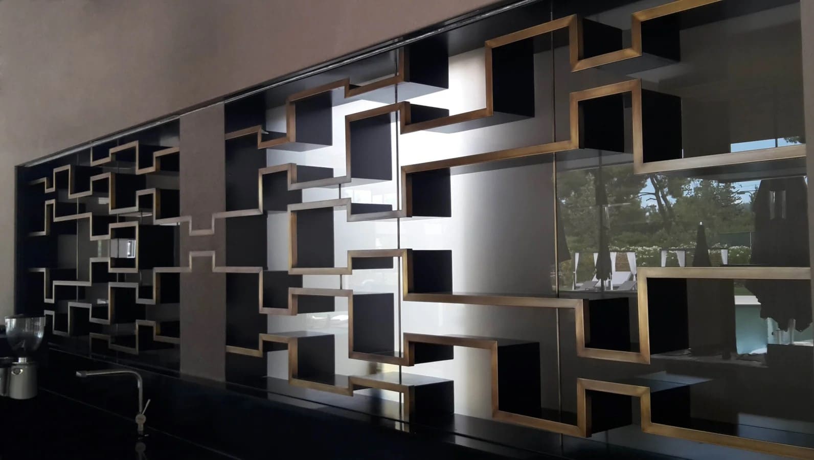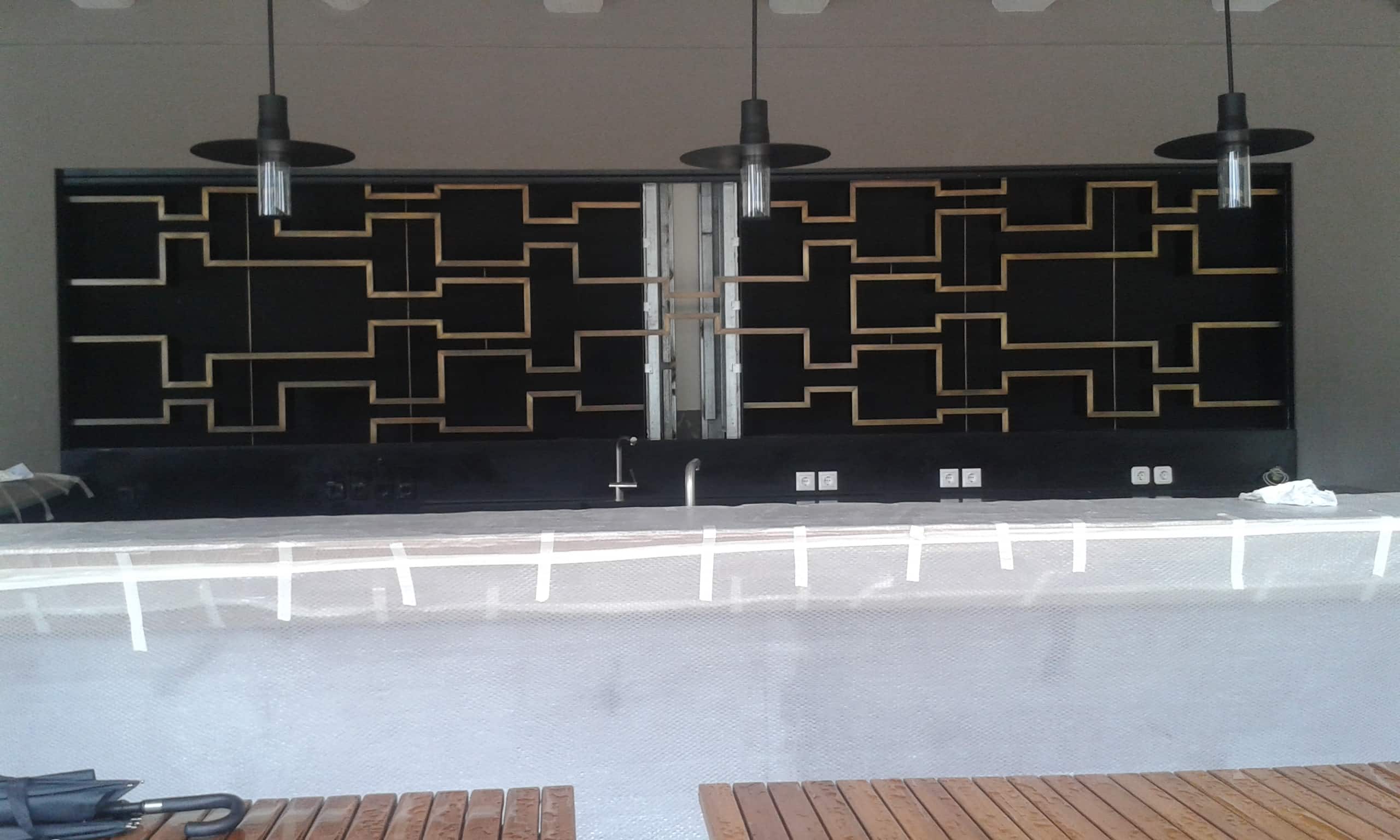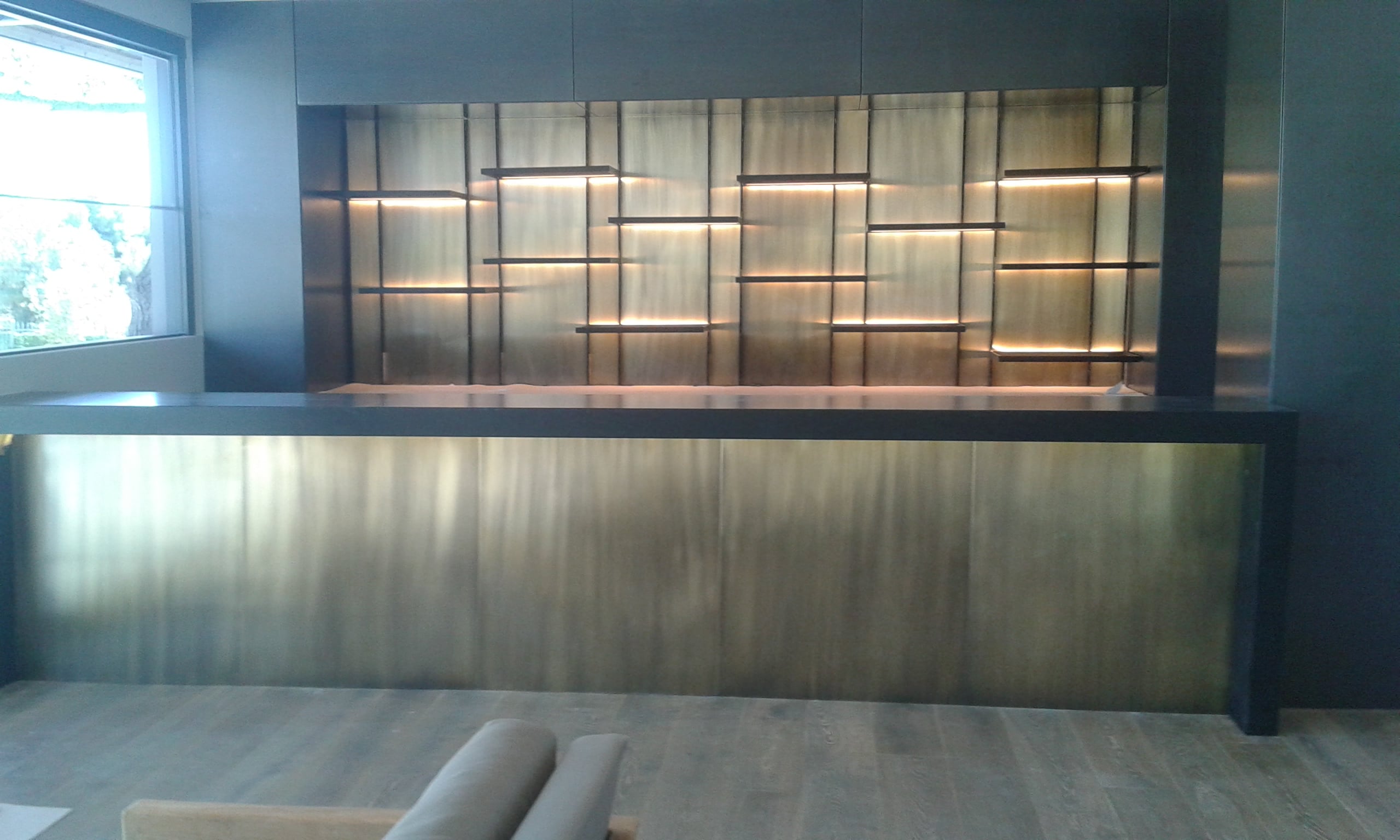 Κατασκευή ραφιών από χάλυβα σε μπαρ πισίνας με επένδυση από γωνιά ορείχαλκου.