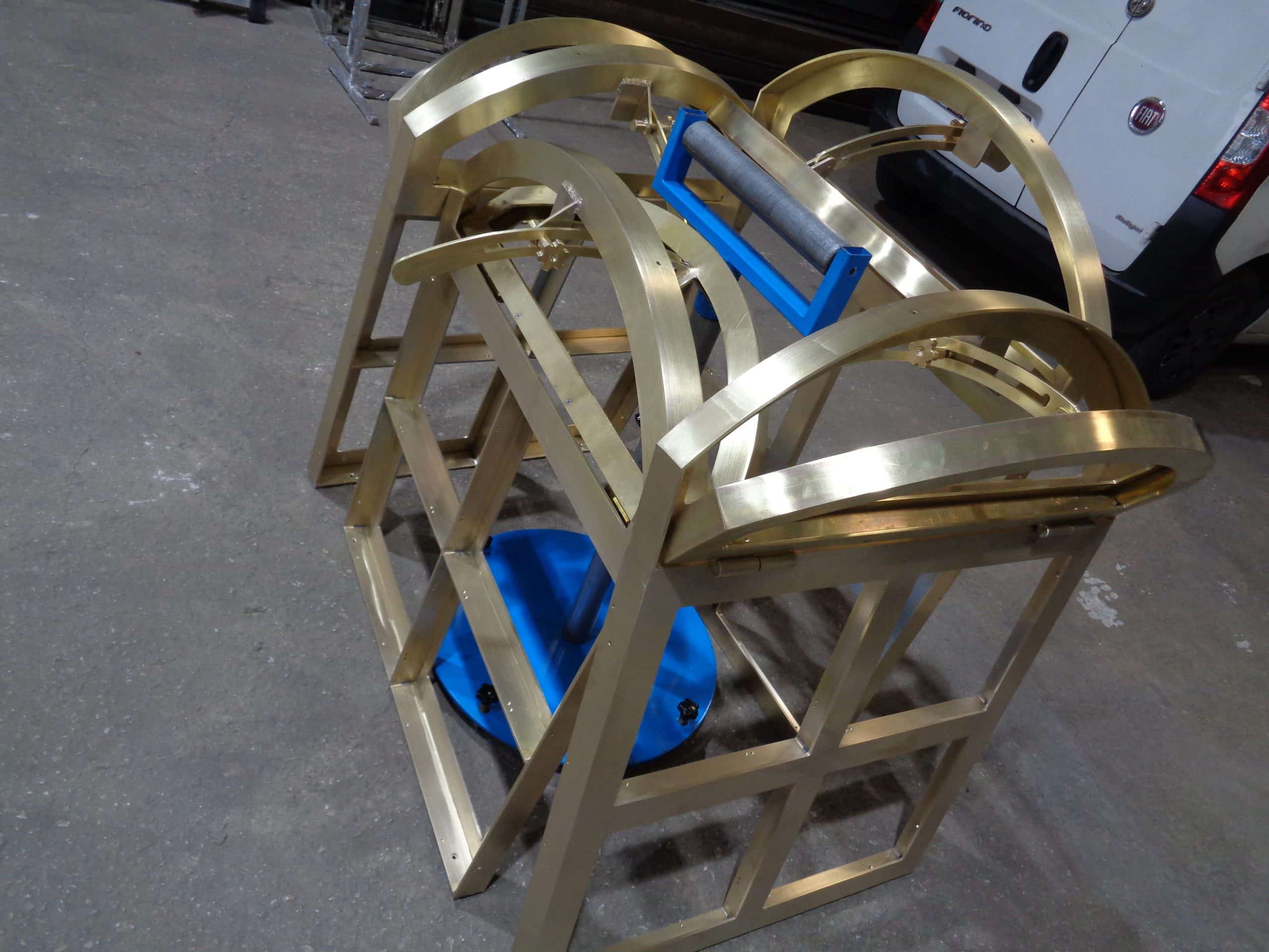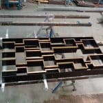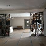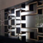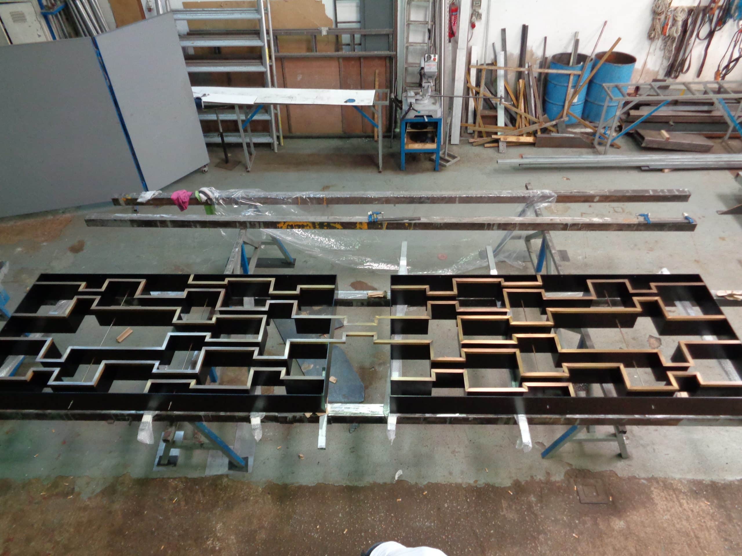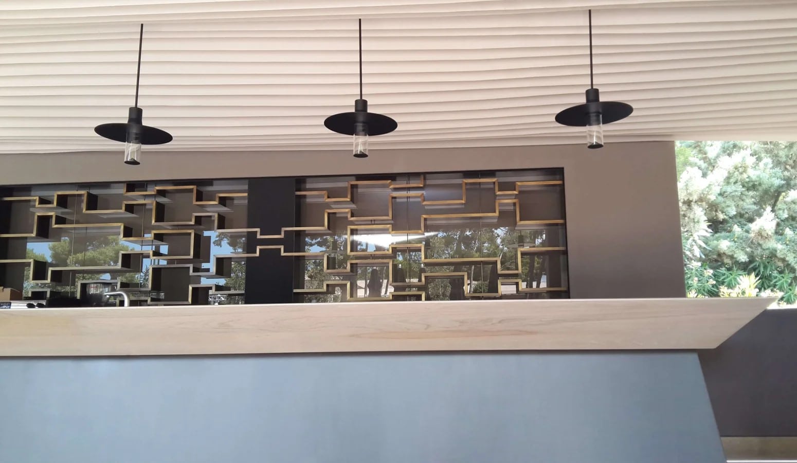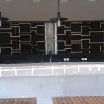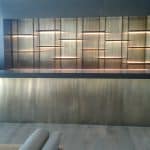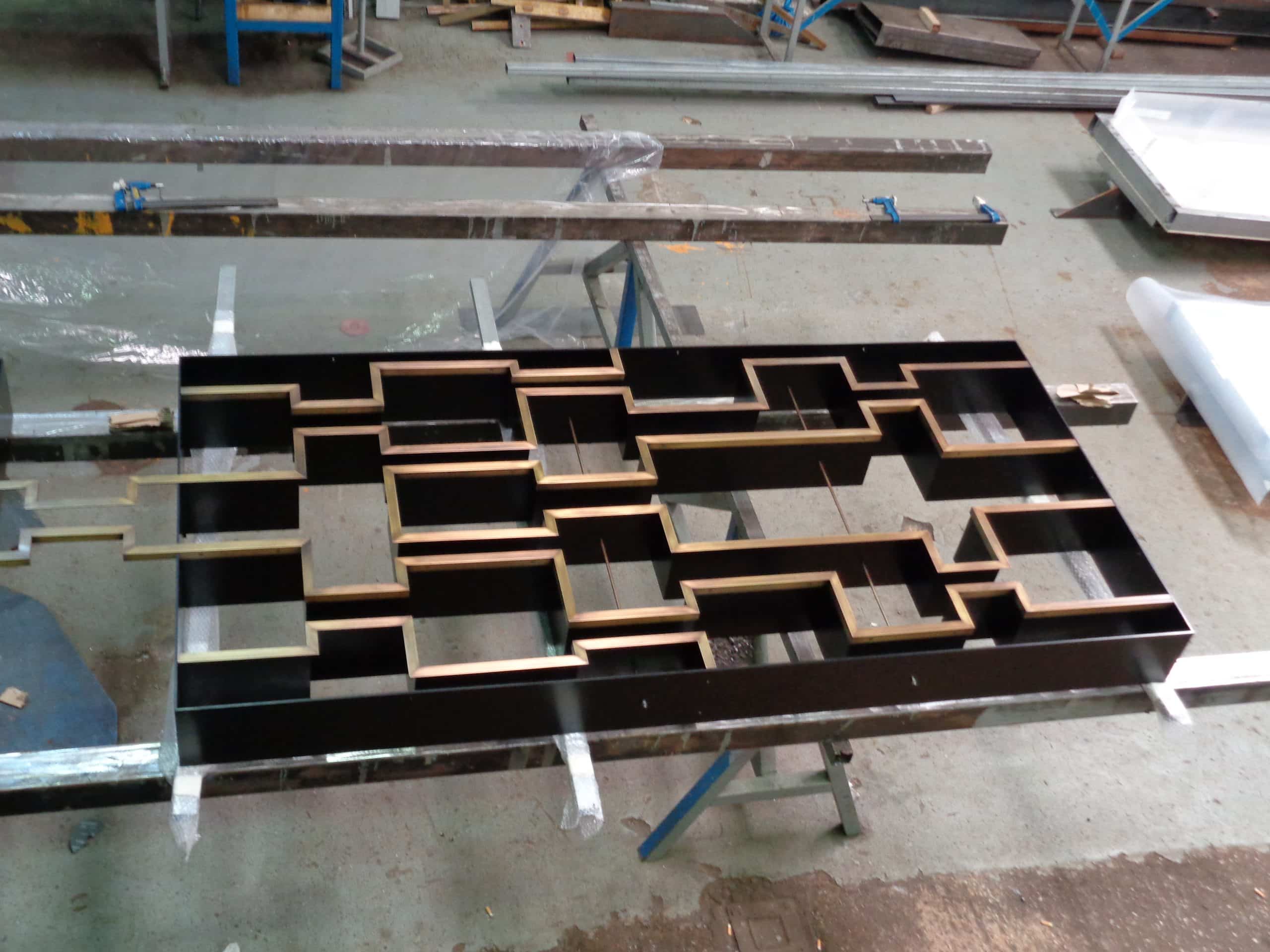 Κατασκευή ραφιών από χάλυβα σε μπαρ πισίνας με επένδυση από γωνιά ορείχαλκου.